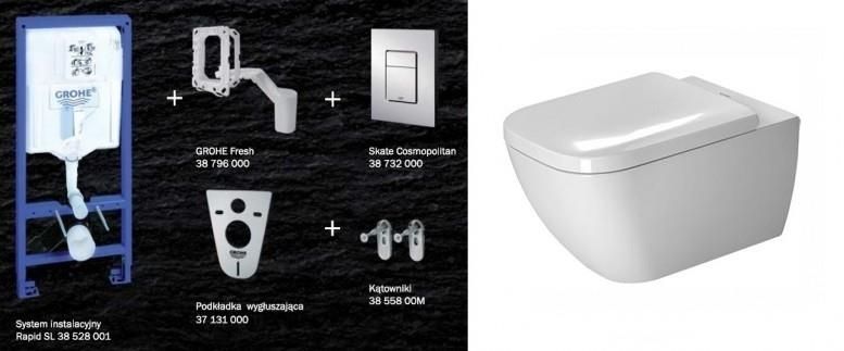 Zestaw 7w1 – gotowy do montau !!!Elementy zestawu:1.Stela Grohe 5w1 – 38827-stela podtynkowy do wc 113cm 38 528 001-wsporniki montaowe 38 558 00M-przycisk Skate Cosmopolitan chrom poysk 38 732-zestaw Grohe Fresh 38 796-podkadka wyguszajca 37 1312. Miska WC wiszcaDuravit HAPPY D.2. 2222090000-bez rantu spukujcego- lejowa- wymiary 54x 36,5 cm- ukryte mocowanie Durafix w komplecie3.Deska sedesowa wolnoopadajca Duravit HAPPY D.2. 0064590000- z systemem zamykania Soft- zdejmowana- zawiasy stalowe