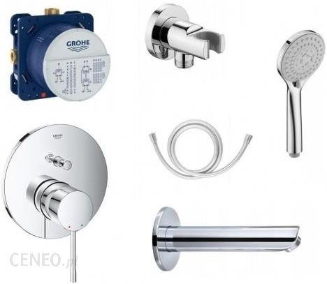 Zestaw natryskowy podtynkowy GROHE Essence 24058001 Nowy Model, słuchawka 5 funkcji, deszczownica 30 cm – 11047 • Bateria podtynkowa – element zewnętrzny Grohe Essence do obsługi dwóch wyjść wody 24058001• Uniwersalny element podtynkowy 1/2″ Grohe Rapido SmartBox 35600000 • Rączka prysznicowa 5-funkcyjna Omnires Yosemite-RCR• Przyłącze kątowe mosiężne Omnires 8873CR• Wąż prysznicowy gładki bezskrętny Omnires Silver-X150SL (150cm)• Wylewka wannowa Omnires WD01 Opis szczegółowy elementów zestawu:Bateria podtynkowa – element zewnętrzny Grohe Essence do obsługi dwóch wyjść wody 24058001• do montażu z GROHE Rapido SmartBox uniwersalny element podtynkowy (35600000)• GROHE SilkMove głowica ceramiczna 46 mm• GROHE StarLight wykończenie chromowane• GROHE QuickFix rozeta ścienna (z uszczelnieniem, zakryte mocowania)• metalowa rozeta ścienna, regulacja 6°• metalowa dźwignia• automatyczny przełącznik: deszczownica / słuchawka• wydajność przepływu: wyjście: B = 27 l/min, wyjście: C = 27 l/min• chrom• gwarancja 5 lat Uniwersalny element podtynkowy 1/2″ Grohe Rapido SmartBox 35600000 • 3 wyjścia wody 1/2″• 2 podłączenia wody od dołu• głębokość instalacji 75-105 mm• mosiężne przyłącza• wstępnie zamontowane przyłącze do płukania • stabilna obudowa i pokrywa ochronna• przygotowane otwory montażowe • do suchej i mokrej zabudowy• uszczelka• gwarancja 10 lat Przyłącze kątowe mosiężne Omnires 8873CR• z uchwytem na rączkę prysznicową• z wkładką ochronną.• wykończenie chrom• gwarancja 2 lata Rączka prysznicowa 5-funkcyjna Omnires YOSEMITE-RCR • 5-funkcyjna, strumienie: masaż, mgła, napowietrzony masaż, napowietrzona mgła, napowietrzony deszcz• Mgła to funkcja strumienia prysznica powstająca poprzez wyrzut drobinek wody z dysz pod olbrzymim ciśnieniem. Tak utworzony strumień jest niezwykle delikatny, a jego odczuwalna temperatura o kilka stopni mniejsza, dzięki czemu stanowi wspaniałe orzeźwienie na koniec kąpieli• Wymiary: Ø 10,2 x 24,8 cm• System Easy Clean zapobiega osadzaniu się brudu i osadów wapiennych; ułatwia także czyszczenie dysz.• System Air miesza wypływającą wodę z powietrzem, dzięki czemu krople są pełniejsze i bardziej miękkie, a prysznic delikatny i relaksujący.• Wykończenie: chrom• Gwarancja: 2 lata Wąż prysznicowy gładki bezskrętny Omnires Silver-X150SL• długość 150 cm• Końcówki 1/2″ x 1/2″, z funkcją zapobiegającą skręcaniu się węża prysznicowego• końcówka ułatwiająca przykręcanie• Kolor: srebrny• Gwarancja: 2 lata Wylewka wannowa Omnires WD01• Zasięg wylewki od powierzchni płytek: 17 cm• Podłączenie: 3/4″• Wykończenie: chrom• Gwarancja: 2 lata