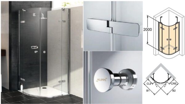 – Rodzaj: półokrągła lub 1/4 koła- Dłuższy bok: 120 cm- Krótszy bok: 90 cm- Wysokość: 200 cm- Wejście: drzwi uchylne- Wypełnienie: szkło przezroczyste- Promień: 500 mm