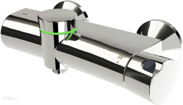Szybko i precyzyjnie reaguje na zmiany temperatury wody zasilającej, utrzymując żądaną temperaturę.Uchwyt regulacji temperatury wyposażony jest w blokadę, którą można wyłączyć włączając przycisk (ustawiony na 38°C).Przycisk EcoLed za pomocą sygnalizacji świetlnej wskazuje idealny czas trwania natrysku biorąc pod uwagę zużycie energii i wody oraz działa jako regulator przepływu.Funkcja natrysku jest uruchamiana przez naciśnięcie EcoLED.Przycisk EcoLed miga zielonym światłem.Jeśli prysznic jest wyłączony w ciągu 2 minut, zielony sygnał miga w nagrodę za ekologiczny prysznic.Jeżeli po dwóch minutach nadal leci woda, zaczyna migać czerwone światło.Po 3 minutach, czerwona lampka zaczyna migać nieprzerwanie. Po upływie 4 minut bateria zamyka się automatycznie.Funkcja prysznica można wyłączyć lub ponownie włączyć w dowolnym momencie przyciskając EcoLED.Sygnalizację świetlną EcoLED można łatwo przeprogramować.Bateria jest dostarczana z filtrami siatkowymi i zaworami zwrotnymi.Posiada rozety i mimośrody.Przycisk EcoLED zasilany jest 2 x 1,5 V bateriami litowymi.Posiada: znak budowlany „B”, atest PZH, deklarację zgodności. Atest Higieniczny PZH HK/W/0904/01/2008Dane techniczne:-Ciśnienie robocze 100 – 1000 kPa-Czas napełniania 10 min (0 – 15 min)-Max czas przepływu 4 min-Przepływ wody dla 300 kPa 0.22 l/s-Spadek ciśnienia dla przepływu (0.2 l/s) 250 kPa-Woda ciepła zasilająca max. 70°C