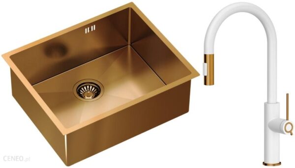 Quadron – zlewozmywak podwieszany stalowy ANTHONY miedziany szczotkowany z baterią JENNIFER Qline biały mat / miedź szczotkowana 46 cm + syfon automat