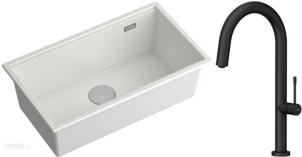 Quadron – zlewozmywak podwieszany/wpuszczany granitowy CLARK 760 alabaster z baterią HALEY Tline czarny mat 40 cm