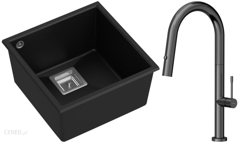 Quadron – zlewozmywak podwieszany granitowy DAVID 40 pure carbon / stal z baterią FELICITY Tline graphite metal 44 cm