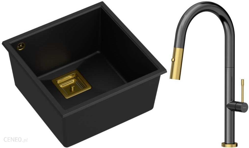 Quadron – zlewozmywak podwieszany granitowy DAVID 40 pure carbon / złoto z baterią FELICITY Tline graphite metal / złoto szczotkowane 44 cm