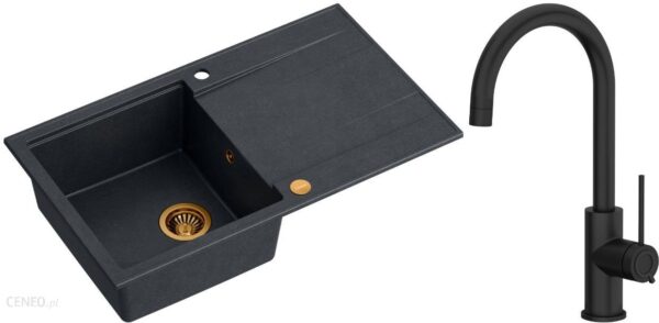 Quadron – zlewozmywak wpuszczany granitowy EVAN 111 black diamond / miedź odwracalny z baterią JODIE Qline czarny mat 35.5 cm + syfon automatyczny