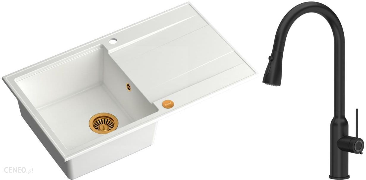 Quadron – zlewozmywak wpuszczany granitowy EVAN 111 snow white / miedź odwracalny z baterią JESSICA Qline czarny mat 47 cm + syfon automatyczny