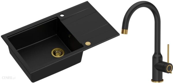 Quadron – zlewozmywak wpuszczany granitowy EVAN 136 XL pure carbon / złoto odwracalny z baterią INGRID Qline czarny mat / złoto szczotkowane 34 cm + s
