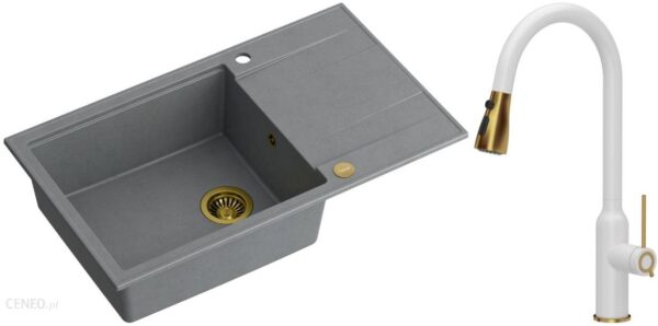 Quadron – zlewozmywak wpuszczany granitowy EVAN 136 XL silver stone / złoto odwracalny z baterią JESSICA Qline biały mat / złoto szczotkowane 47 cm +