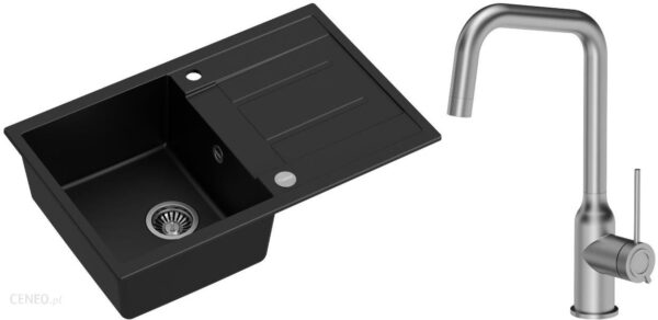 Quadron – zlewozmywak wpuszczany granitowy MORGAN 111 pure carbon / stal odwracalny z baterią NATALIE Qline stal szczotkowana 34 cm + syfon automatycz