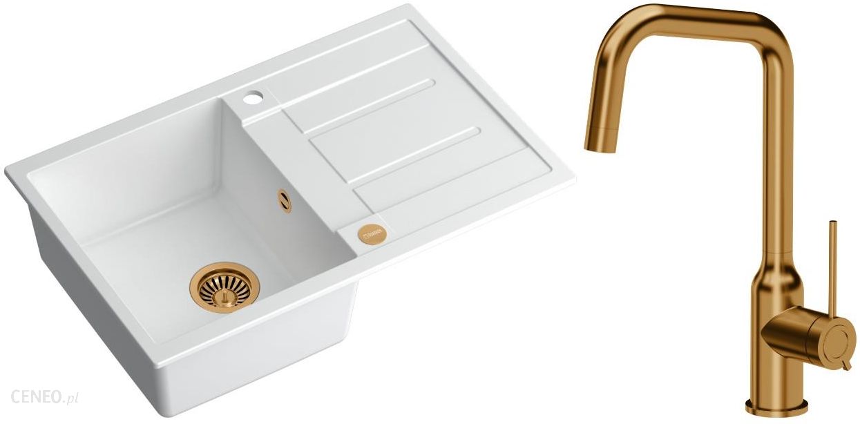 Quadron – zlewozmywak wpuszczany granitowy MORGAN 111 snow white / miedź odwracalny z baterią NATALIE Qline miedź szczotkowana 34 cm + syfon automatyc