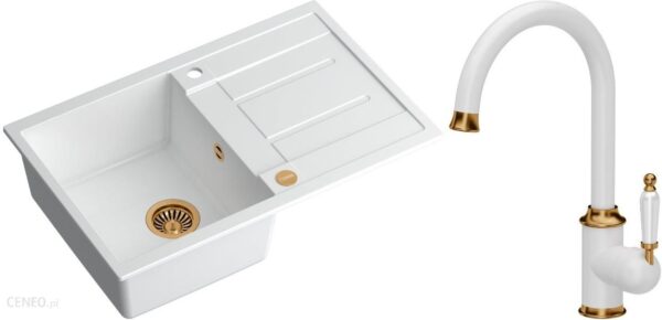 Quadron – zlewozmywak wpuszczany granitowy MORGAN 111 snow white / miedź odwracalny z baterią RACHEL Qline biały mat / miedź szczotkowana / biała cera