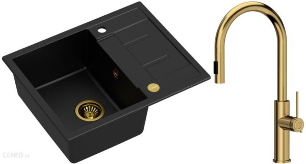 Quadron – zlewozmywak wpuszczany granitowy MORGAN 116 pure carbon / złoto odwracalny z baterią JENNIFER Qline złoto szczotkowane 46 cm + syfon automat