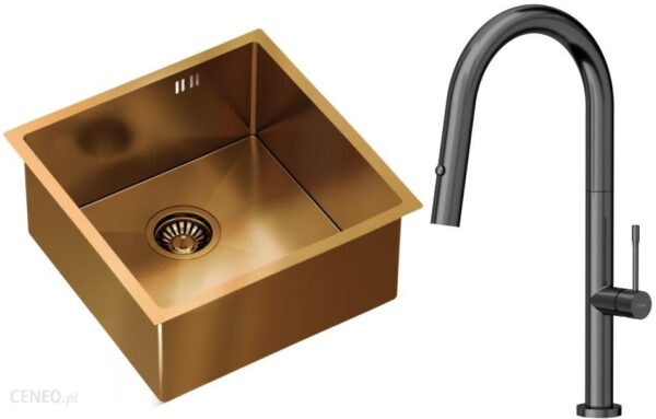 Quadron – zlewozmywak podwieszany stalowy PAUL miedziany szczotkowany z baterią FELICITY Tline graphite metal 44 cm + syfon automatyczny