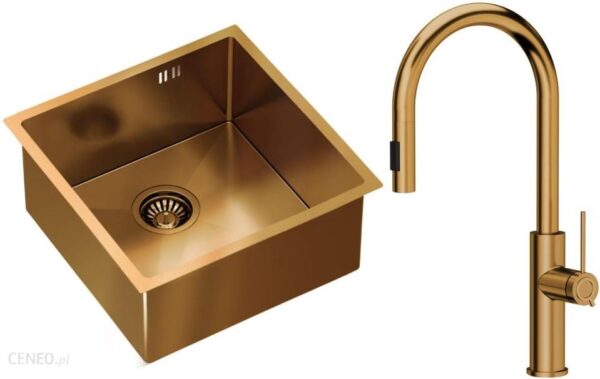 Quadron – zlewozmywak podwieszany stalowy PAUL miedziany szczotkowany z baterią JENNIFER Qline miedź szczotkowana 46 cm + syfon automatyczny