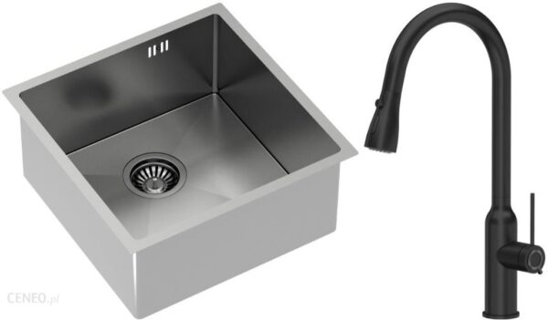 Quadron – zlewozmywak wpuszczany stalowy PAUL stal szczotkowana z baterią JESSICA Qline czarny mat 47 cm + syfon automatyczny