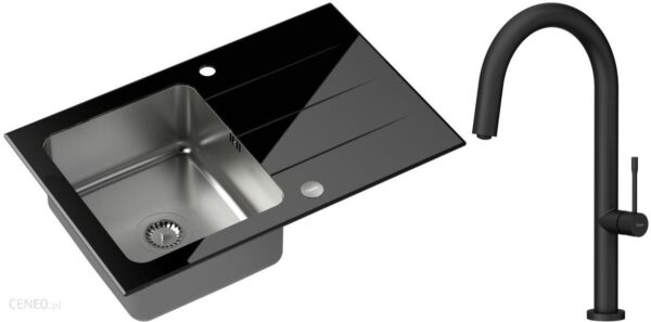 Quadron – zlewozmywak wpuszczany szklany FORD 111 blat czarny / komora stalowa odwracalny z baterią HALEY Tline czarny mat 40 cm
