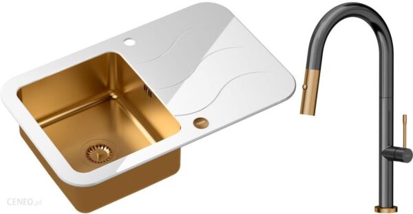 Quadron – zlewozmywak wpuszczany szklany GLEN 211 blat biały / komora miedziana odwracalny z baterią FELICITY Tline graphite metal / miedź szczotkowan