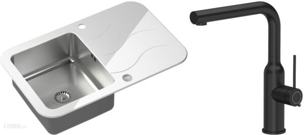 Quadron – zlewozmywak wpuszczany szklany GLEN 211 blat biały / komora stalowa odwracalny z baterią ANGELINA Qline czarny mat 31 cm