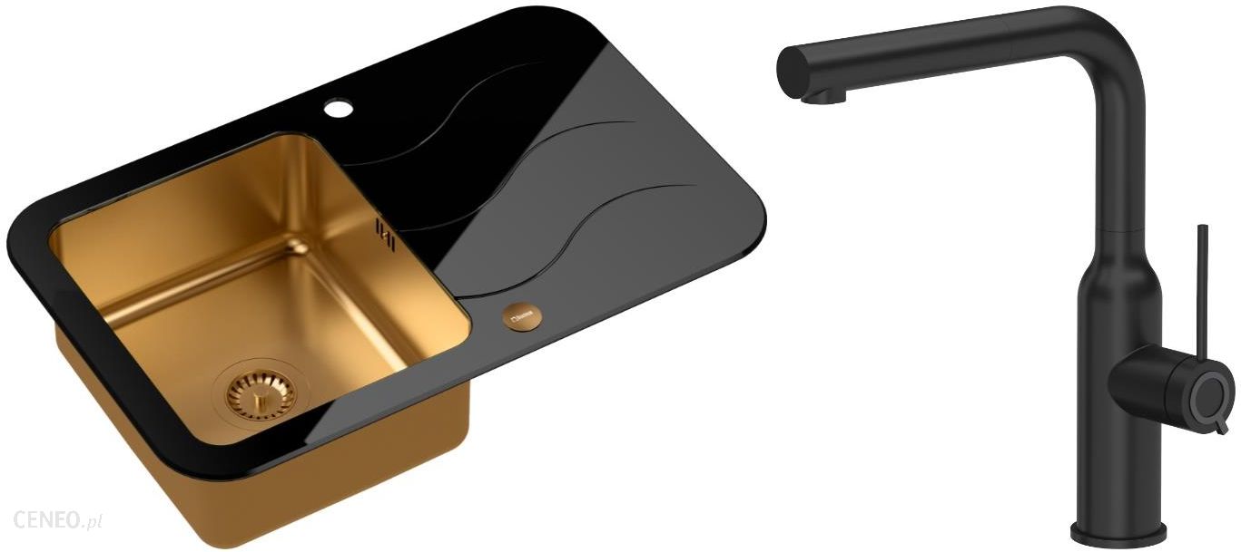 Quadron – zlewozmywak wpuszczany szklany GLEN 211 blat czarny / komora miedziana odwracalny z baterią ANGELINA Qline czarny mat 31 cm