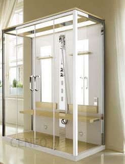 Wysokość całkowita z brodzikiem h 15 cm – 242 cm Wyposażenie standardowe: dach z tworzywa HPL wykończony drewnem, regulowany hydromasaż, 2 deszczownice, słuchawka z chromowanego mosiądzu. Elementy z tworzywa HPL wykończone drewnem: siedzisko, oparcie, 2 półki, podłoga. Sauna plus: (sauna parowa, aromaterapia, radio FM RDS stereo, podłaczenie do MP3, chromoterapia – 2 lampy), zdalne sterownie w pilocie z dotykowym ekranem.